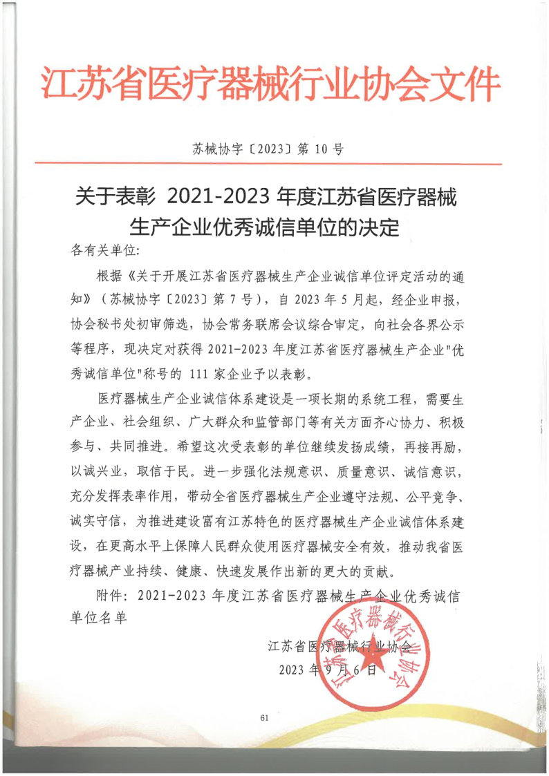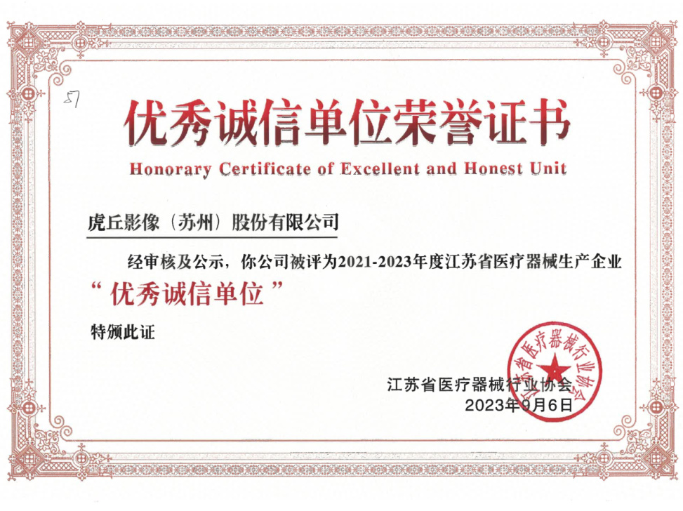 近日,虎丘影像再次獲得江蘇省醫(yī)療器械行業(yè)協(xié)會(huì)評(píng)選的“優(yōu)秀誠信單位”榮譽(yù)稱號(hào)。